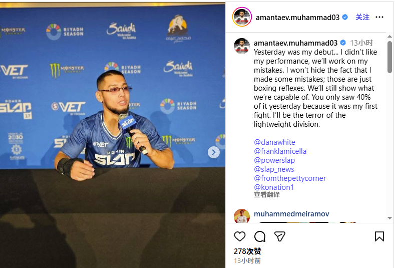 据悉,赵鸿刚的对手阿曼塔耶夫手部也受了伤,他在社交媒体上表示:“昨天是我的耳光力量赛事首秀,但我不喜欢我的表现,接下来我会弥补我的错误。我不会隐瞒我犯了一些错误的事实,那些只是拳击手的本能反应,我会继续展示我的能力。你们昨天只看了我40%的实力,因为这是我的第一次比赛,我会成为轻量级(70公斤)霸主。”